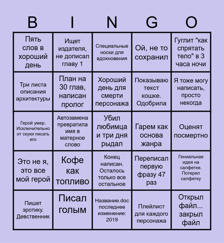 This bingo card has 25 words: Это не я, это все мой герой, Писал голым, Убил любимца и три дня рыдал, Плейлист для каждого персонажа, Гуглит "как спрятать тело" в 3 часа ночи, Пять слов в хороший день, Ищет издателя, не дописал главу 1, Специальные носки для вдохновения, Гарем как основа жанра, Гениальная идея на салфетке. Потерял салфетку, Три листа описания архитектуры, План на 30 глав, написан пролог, Название.doc последнее изменение: 2019, Переписал первую фразу 47 раз, Я тоже могу написать, просто некогда, Пишет эротику. Девственник, Автозамена превратила имя в матерное слово, Хороший день для смерти персонажа, Показываю текст кошке. Одобрила, Оценят посмертно, Герой умер. Исключительно от скуки писать его, Кофе как топливо, Конец написан. Осталось только все остальное, Ой, не то сохранил and Открыл файл... закрыл файл.