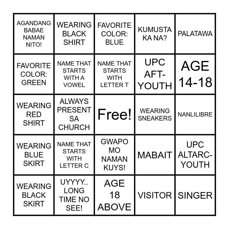 This bingo card has a free space and 28 words: UPC ALTARC- YOUTH, UPC CENTRO- YOUTH, UPC AFT-YOUTH, VISITOR, FAVORITE COLOR: GREEN, FAVORITE COLOR: BLUE, WEARING BLACK SHIRT, WEARING BLUE SKIRT, WEARING SNEAKERS, WEARING BLACK SKIRT, WEARING RED SHIRT, KUMUSTA KA NA?, UYYYY.. LONG TIME NO SEE!, AGE 18 ABOVE, AGE 14-18, NAME THAT STARTS WITH LETTER M, NAME THAT STARTS WITH LETTER C, NAME THAT STARTS WITH A VOWEL, NAME THAT STARTS WITH LETTER T, GWAPO MO NAMAN KUYS!, AGANDANG BABAE NAMAN NITO!, MUSICIAN, SINGER, ALWAYS PRESENT SA CHURCH, NANLILIBRE, MABAIT, PALATAWA and MAHIYAIN.