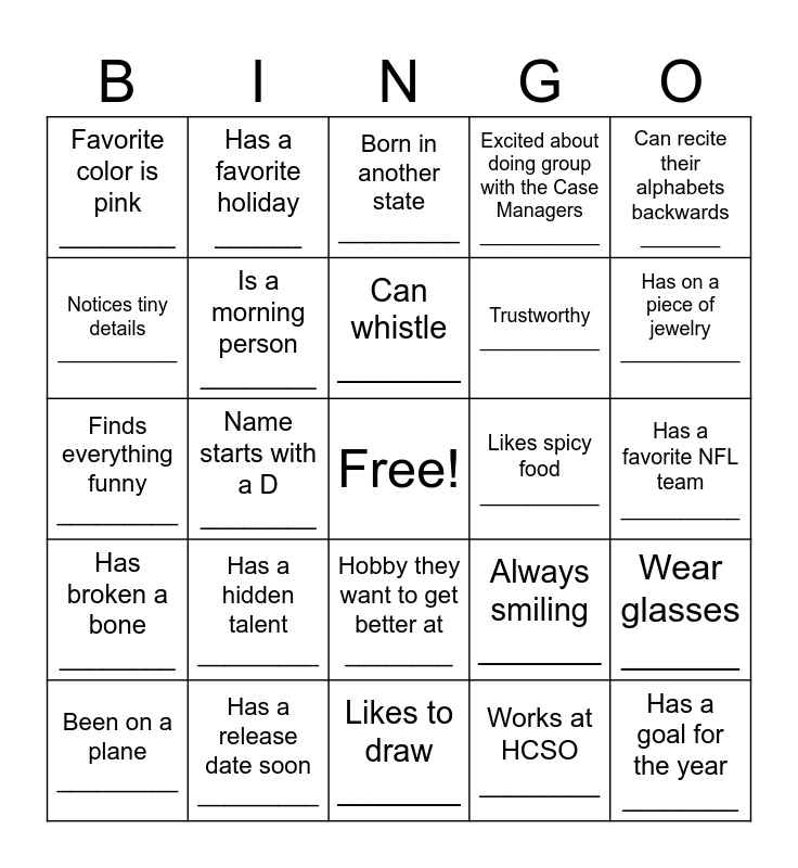 This bingo card has a free space and 29 words: Been on a plane _________, Has a food allergy ______, Name starts with a D ________, Has more than five tattoos ________, Favorite color is pink ________, Born in another state _________, Is a morning person ________, Has a hidden talent _________, Likes spicy food __________, Has a release date soon _________, Has a favorite NFL team __________, Has a goal for the year ________, Likes to draw _______, Works at HCSO ________, Has on a piece of jewelry ___________, Has a sibling _______, Hobby they want to get better at ________, Has broken a bone ________, Can recite their alphabets backwards _______, Finds everything funny _________, Always smiling _______, Always has a plan _________, Trustworthy ___________, Notices tiny details ___________, Excited about doing group with the Case Managers ___________, Has a favorite holiday ______, Wear glasses ______, Can whistle _______ and Birthday in the winter _________.