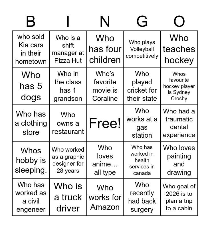 This bingo card has a free space and 24 words: Who worked as a graphic designer for 28 years, Who is a truck driver, Who’s favorite movie is Coraline, Who has worked as a civil engeneer, Who teaches hockey, who sold Kia cars in their hometown, Who has 5 dogs, Who is a shift manager at Pizza Hut, Who works at a gas station, Who loves anime…all type, Who played cricket for their state, Who has a clothing store, Who has worked in health services in canada, Who loves painting and drawing, Who in the class has 1 grandson, Who recently had back surgery, Who had a traumatic dental experience, Who has four children, Whos favourite hockey player is Sydney Crosby, Who owns a restaurant, Who goal of 2026 is to plan a trip to a cabin, Whos hobby is sleeping., Who plays Volleyball competitively and Who works for Amazon.
