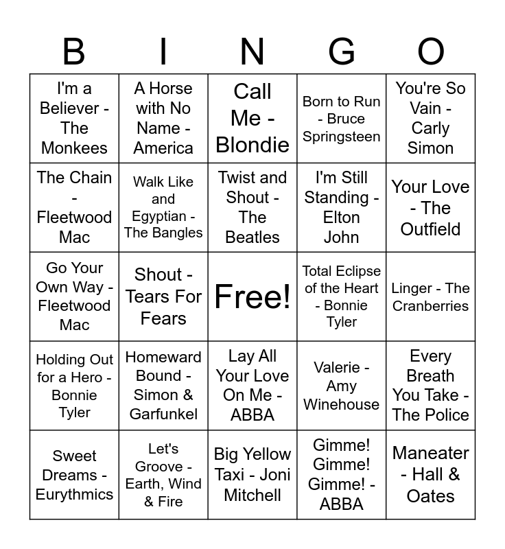 This bingo card has a free space and 48 words: Take on Me - a-ha, Maneater - Hall & Oates, Jolene - Dolly Parton, Big Yellow Taxi - Joni Mitchell, Homeward Bound - Simon & Garfunkel, SOS - ABBA, A Horse with No Name - America, Lovely Day - Bill Withers, The Chain - Fleetwood Mac, California Dreamin' - The Mamas & The Papas, Walk Like and Egyptian - The Bangles, Born to Run - Bruce Springsteen, Every Breath You Take - The Police, Valerie - Amy Winehouse, Your Song - Elton John, With Or Without You - U2, Twist and Shout - The Beatles, Total Eclipse of the Heart - Bonnie Tyler, Burning Love - Elvis Presley, You're So Vain - Carly Simon, Shout - Tears For Fears, Gimme! Gimme! Gimme! - ABBA, I'm a Believer - The Monkees, I'm Still Standing - Elton John, Break My Stride - Matthew Wilder, Your Love - The Outfield, Sweet Dreams - Eurythmics, Rosanna - TOTO, Lay All Your Love On Me - ABBA, Holding Out for a Hero - Bonnie Tyler, Fast Car - Tracy Chapman, Super Trouper - ABBA, Send Me On My Way - Rusted Root, I Want You Back - The Jackson 5, Let's Groove - Earth, Wind & Fire, Grease - Franki Valli, Saturday in the Park - Chicago, Linger - The Cranberries, Ain't No Sunshine - Bill Withers, Lean on Me - Bill Withers, Bad Moon Rising - Creedence Clearwater Revival, I Wanna Dance with Somebody - Whitney Houston, Call Me - Blondie, Build Me Up Buttercup - The Foundations, Go Your Own Way - Fleetwood Mac, I Melt with You - Modern English, Stuck In The Middle With You - Stealers Wheel and Run-Around - Blues Traveler.