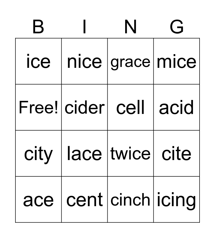 This bingo card has 16 words: cent, cite, grace, ice, city, nice, twice, cinch, Free!, cider, ace, mice, lace, acid, cell and icing.