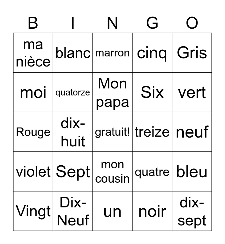 This bingo card has a free space and 24 words: Sept, Dix-Neuf, Mon papa, Vingt, Gris, ma nièce, moi, blanc, treize, mon cousin, Six, Rouge, quatre, bleu, quatorze, noir, neuf, marron, vert, dix-huit, dix-sept, violet, cinq and un.