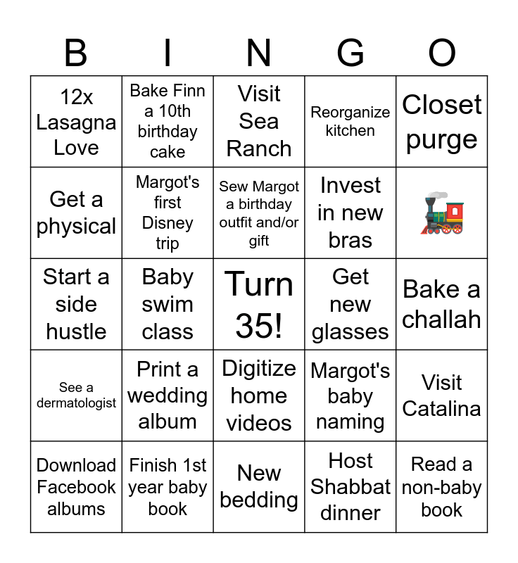 This bingo card has a free space and 24 words: Print a wedding album, Finish 1st year baby book, Sew Margot a birthday outfit and/or gift, Download Facebook albums, Closet purge, 12x Lasagna Love, Get a physical, Bake Finn a 10th birthday cake, Get new glasses, Digitize home videos, Invest in new bras, Start a side hustle, Margot's baby naming, Visit Catalina, Margot's first Disney trip, Host Shabbat dinner, Bake a challah, Visit Sea Ranch, 🚂, Baby swim class, Read a non-baby book, See a dermatologist, Reorganize kitchen and New bedding.