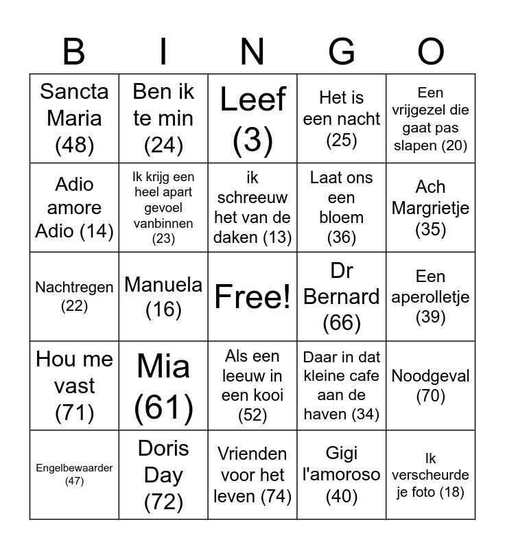 This bingo card has a free space and 75 words: Met de vlam in de pijp (1), Er staat een paard in de gang (2), Leef (3), Je denkt maar dat je alles mag van mij (4), de Clown (5), Waarom fluister ik je naam nog (6), mexico (7), Rosanne (8), Helikopter (9), Met Romana op de scooter (10), Schatje mag ik je foto (11), Laat de zon in je hart (12), ik schreeuw het van de daken (13), Adio amore Adio (14), Als sterren aan de hemel staan (15), Manuela (16), Heb je even voor mij (17), Ik verscheurde je foto (18), Kleine jodeljongen (19), Een vrijgezel die gaat pas slapen (20), Rood zijn de rozen (21), Nachtregen (22), Ik krijg een heel apart gevoel vanbinnen (23), Ben ik te min (24), Het is een nacht (25), Oerend hard (26), Malle Babbe (27), s Nachts na tweeën (28), Zoutelande (29), Zwart wit (30), Afscheid (31), Sinds een dag of twee (32), Zo mooi, zo blond en zo alleen (33), Daar in dat kleine cafe aan de haven (34), Ach Margrietje (35), Laat ons een bloem (36), Dag vreemde man (37), Laat het gras maar groeien (38), Een aperolletje (39), Gigi l'amoroso (40), Rode rozen in de sneeuw (41), Ik ben verliefd op jou (42), Ik hou van u (43), Saragossa (44), Het kan niet zijn (45), Oh Heideroosje (46), Engelbewaarder (47), Sancta Maria (48), Zeven anjers, zeven rozen (49), Annabel (50), Sweet Caroline (51), Als een leeuw in een kooi (52), Vlieg met me mee (53), Kom van dat dak af (54), t Is weer voorbij die mooie zomer (55), Een kopje koffie (56), Je loog tegen mij (57), Roosje m'n roosje (58), t Was aan de Costa del Sol (59), Drink rode wijn (60), Mia (61), Verover mij (62), Blauw (63), Rozen van Sandra (64), Zomersproetjes (65), Dr Bernard (66), Goeiemorgen morgen (67), Ik wil je (68), Porselein (69), Noodgeval (70), Hou me vast (71), Doris Day (72), De roos (73), Vrienden voor het leven (74) and Jij bent de zon (75).