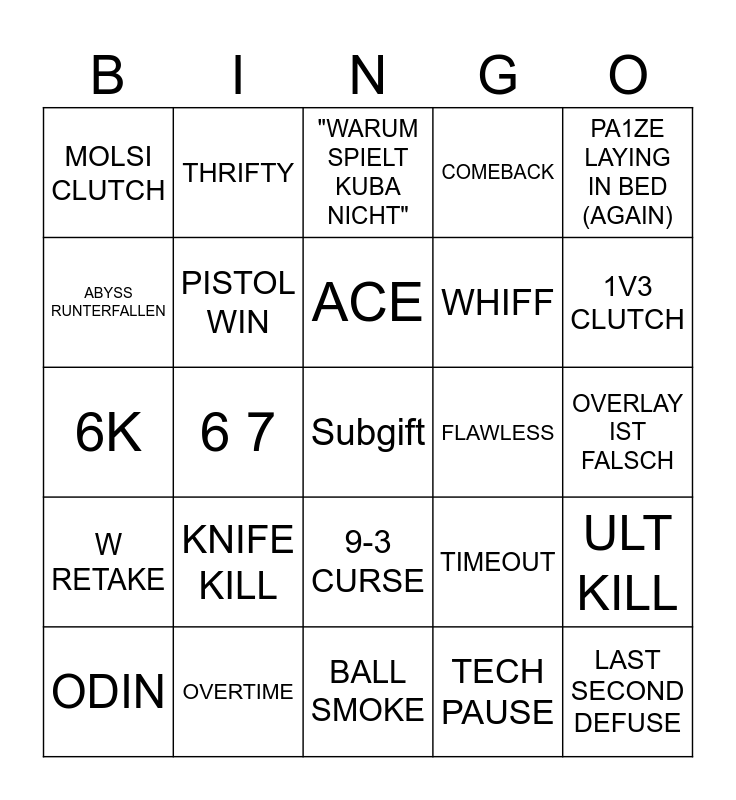 This bingo card has a free space and 24 words: KNIFE KILL, OVERTIME, ACE, ODIN, PA1ZE LAYING IN BED (AGAIN), MOLSI CLUTCH, ABYSS RUNTERFALLEN, THRIFTY, FLAWLESS, 9-3 CURSE, WHIFF, 6K, TIMEOUT, ULT KILL, PISTOL WIN, TECH PAUSE, OVERLAY IST FALSCH, "WARUM SPIELT KUBA NICHT", 1V3 CLUTCH, 6 7, LAST SECOND DEFUSE, W RETAKE, COMEBACK and BALL SMOKE.