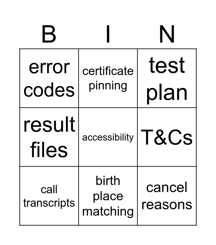 This bingo card has 10 words: birth place matching, test plan, error codes, accessibility, result files, call transcripts, certificate pinning, agent training, T&Cs and cancel reasons.