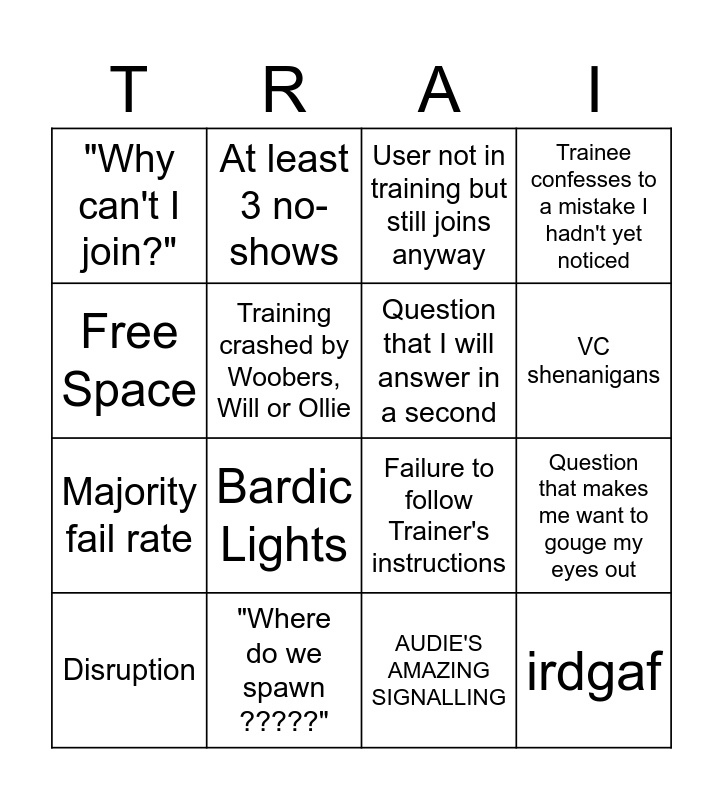 This bingo card has 16 words: "Where do we spawn ?????", Question that makes me want to gouge my eyes out, User not in training but still joins anyway, "Why can't I join?", Majority fail rate, At least 3 no-shows, Failure to follow Trainer's instructions, AUDIE'S AMAZING SIGNALLING, Free Space, Training crashed by Woobers, Will or Ollie, Disruption, Trainee confesses to a mistake I hadn't yet noticed, Bardic Lights, VC shenanigans, Question that I will answer in a second and irdgaf.