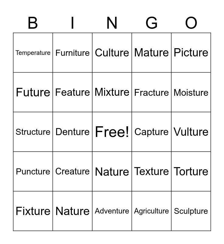 This bingo card has a free space and 25 words: Creature, Adventure, Mixture, Fixture, Picture, Temperature, Future, Furniture, Capture, Nature, Fracture, Structure, Texture, Torture, Feature, Scripture, Vulture, Culture, Moisture, Denture, Sculpture, Nature, Puncture, Mature and Agriculture.
