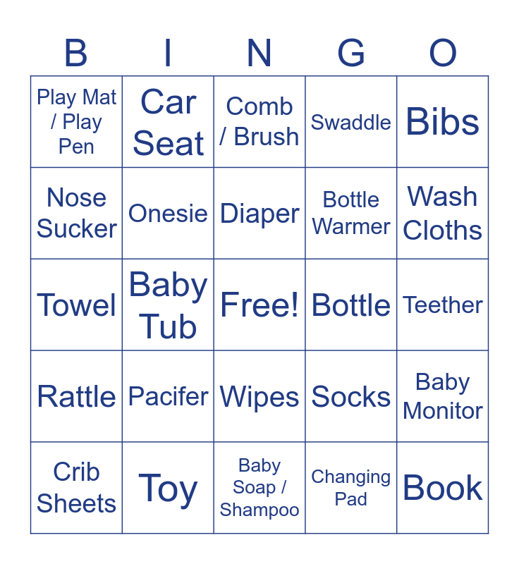 This bingo card has a free space and 24 words: Pacifer, Toy, Diaper, Crib Sheets, Bibs, Play Mat / Play Pen, Nose Sucker, Car Seat, Bottle, Wipes, Bottle Warmer, Towel, Socks, Baby Monitor, Onesie, Changing Pad, Teether, Comb / Brush, Wash Cloths, Baby Tub, Book, Rattle, Swaddle and Baby Soap / Shampoo.