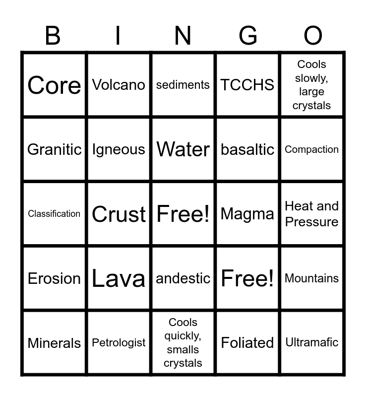 This bingo card has a free space and 29 words: Minerals, Glassy, Crust, Mantle, Core, sediments, Igneous, Lava, Magma, Petrologist, Heat and Pressure, Ultramafic, Cools quickly, smalls crystals, Foliated, Compaction, Metamorphic, andestic, Erosion, Cools slowly, large crystals, Classification, Free!, Sedimentary, basaltic, Granitic, TCCHS, Volcano, Mountains, Water and melting.