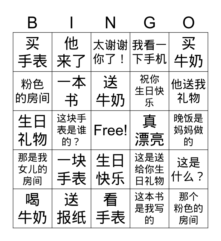 This bingo card has a free space and 24 words: 一块手表, 送 报纸, 送 牛奶, 喝 牛奶, 买 牛奶, 买 手表, 粉色 的房间, 他 来了, 真 漂亮, 生日快乐, 祝你 生日快乐, 生日礼物, 这是送给你生日礼物, 这是 什么?, 一本书, 这本书 是我写的, 晚饭是 妈妈做的, 太谢谢你了!, 他送我礼物, 这块手表是谁的?, 那个 粉色的 房间, 那是我女儿的房间, 我看一下手机 and 看 手表.