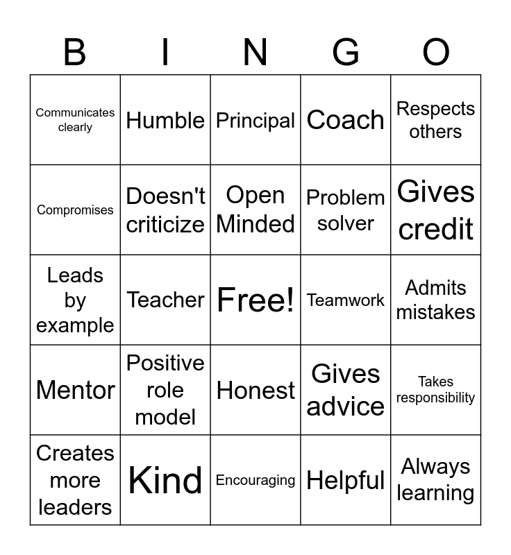 This bingo card has a free space and 26 words: Honest, Helpful, Open Minded, Kind, Respects others, Communicates clearly, Compromises, Humble, Admits mistakes, Gives advice, Problem solver, Leads by example, Takes responsibility, Creates more leaders, Teacher, Parent, Coach, Mentor, Principal, Always learning, Gives credit, Encouraging, Teamwork, Positive role model, Doesn't criticize and Offers helpful feedback.