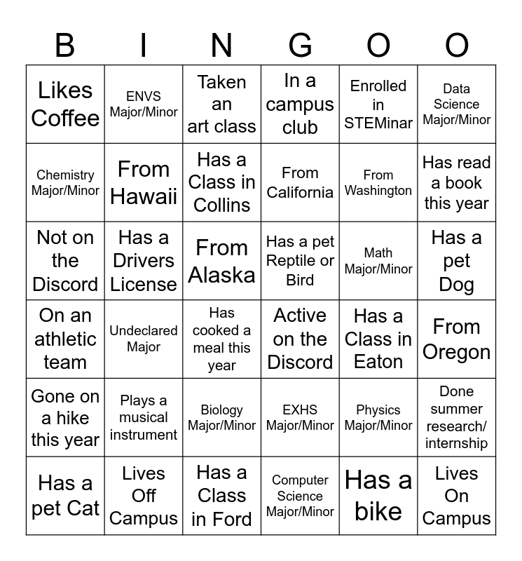 This bingo card has 36 words: On an athletic team, Undeclared Major, Has a Class in Ford, From California, Math Major/Minor, Has a pet Dog, Likes Coffee, Lives Off Campus, Taken an art class, EXHS Major/Minor, From Washington, Data Science Major/Minor, Gone on a hike this year, Has a Drivers License, Has a Class in Collins, In a campus club, Physics Major/Minor, From Oregon, Chemistry Major/Minor, From Hawaii, Has cooked a meal this year, Active on the Discord, Has a Class in Eaton, Done summer research/ internship, Not on the Discord, ENVS Major/Minor, From Alaska, Computer Science Major/Minor, Enrolled in STEMinar, Has read a book this year, Has a pet Cat, Plays a musical instrument, Biology Major/Minor, Has a pet Reptile or Bird, Has a bike and Lives On Campus.