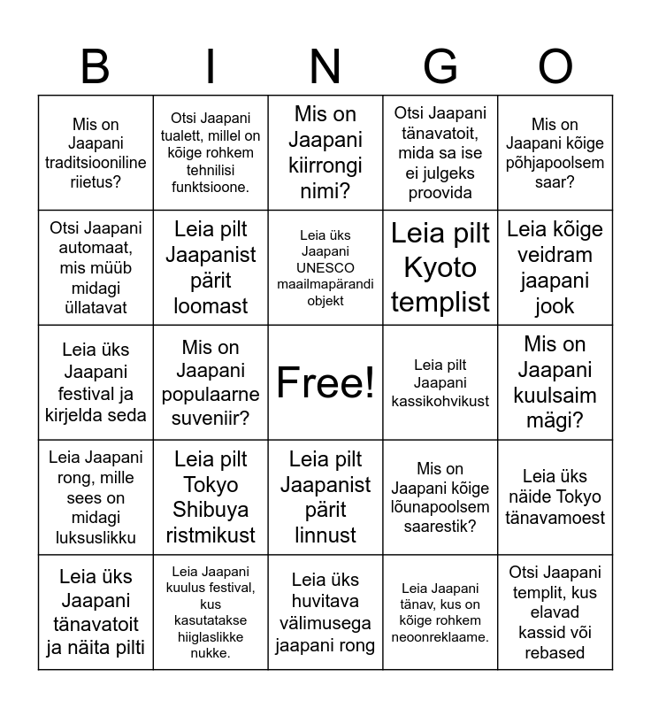 This bingo card has a free space and 24 words: Leia pilt Tokyo Shibuya ristmikust, Leia Jaapani kuulus festival, kus kasutatakse hiiglaslikke nukke., Leia üks Jaapani UNESCO maailmapärandi objekt, Leia üks Jaapani tänavatoit ja näita pilti, Mis on Jaapani kõige põhjapoolsem saar?, Mis on Jaapani traditsiooniline riietus?, Otsi Jaapani automaat, mis müüb midagi üllatavat, Otsi Jaapani tualett, millel on kõige rohkem tehnilisi funktsioone., Leia pilt Jaapani kassikohvikust, Leia pilt Jaapanist pärit linnust, Leia pilt Kyoto templist, Leia üks Jaapani festival ja kirjelda seda, Mis on Jaapani kõige lõunapoolsem saarestik?, Leia üks näide Tokyo tänavamoest, Leia pilt Jaapanist pärit loomast, Leia Jaapani tänav, kus on kõige rohkem neoonreklaame., Mis on Jaapani kuulsaim mägi?, Mis on Jaapani kiirrongi nimi?, Leia kõige veidram jaapani jook, Mis on Jaapani populaarne suveniir?, Otsi Jaapani templit, kus elavad kassid või rebased, Leia Jaapani rong, mille sees on midagi luksuslikku, Otsi Jaapani tänavatoit, mida sa ise ei julgeks proovida and Leia üks huvitava välimusega jaapani rong.
