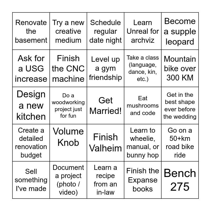 This bingo card has a free space and 24 words: Sell something I've made, Volume Knob, Level up a gym friendship, Finish the Expanse books, Become a supple leopard, Renovate the basement, Try a new creative medium, Schedule regular date night, Eat mushrooms and code, Get in the best shape ever before the wedding, Design a new kitchen, Finish the CNC machine, Learn to wheelie, manual, or bunny hop, Go on a 50+km road bike ride, Ask for a USG increase, Document a project (photo / video), Learn a recipe from an in-law, Learn Unreal for archviz, Mountain bike over 300 KM, Create a detailed renovation budget, Do a woodworking project just for fun, Finish Valheim, Take a class (language, dance, kin, etc.) and Bench 275.