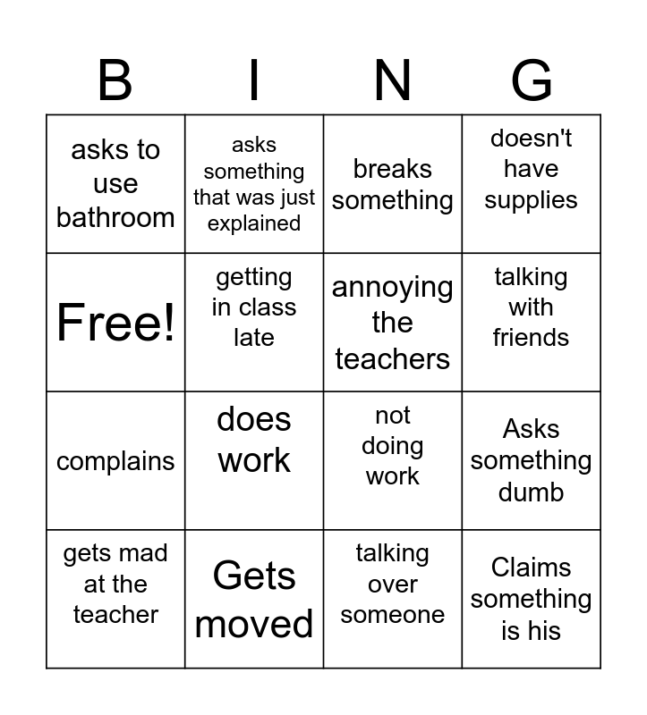 This bingo card has 16 words: Gets moved, Asks something dumb, breaks something, asks to use bathroom, complains, asks something that was just explained, not doing work, talking over someone, Free!, getting in class late, gets mad at the teacher, doesn't have supplies, does work, talking with friends, annoying the teachers and Claims something is his.