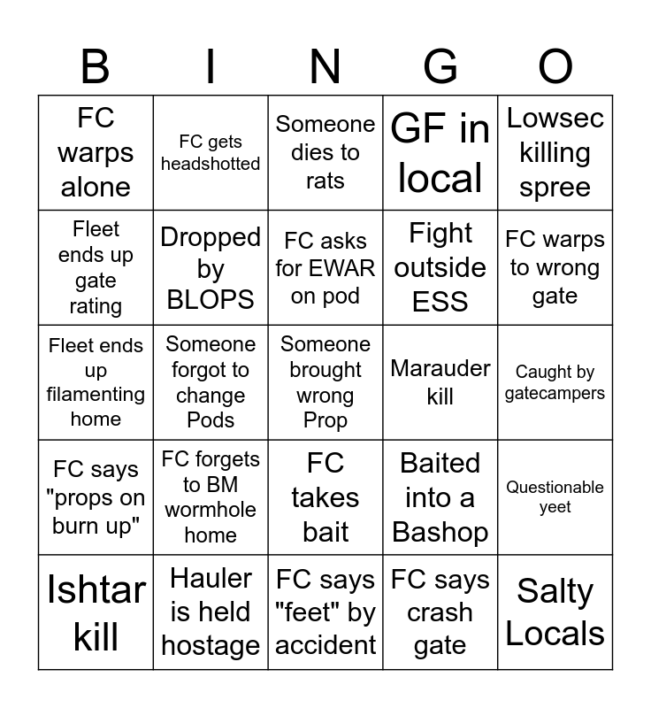 This bingo card has 25 words: FC forgets to BM wormhole home, FC says "feet" by accident, FC asks for EWAR on pod, Ishtar kill, Lowsec killing spree, FC warps alone, Fleet ends up gate rating, FC gets headshotted, Marauder kill, FC takes bait, Fight outside ESS, Fleet ends up filamenting home, Baited into a Bashop, Questionable yeet, Dropped by BLOPS, Salty Locals, Caught by gatecampers, Someone dies to rats, FC warps to wrong gate, Someone forgot to change Pods, Someone brought wrong Prop, Hauler is held hostage, FC says "props on burn up", GF in local and FC says crash gate.
