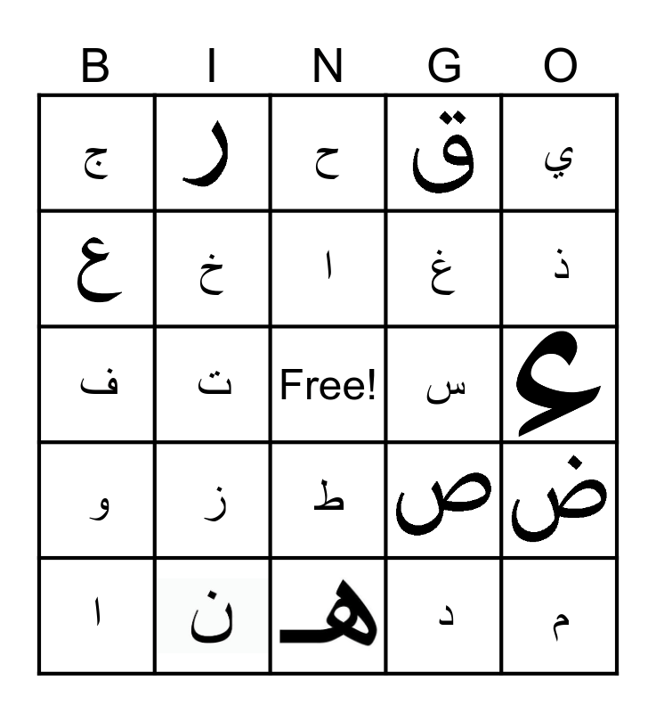 This bingo card has 8 images, a free space and 21 words: ا, ب, ت, ث, ج, ح, خ, ز, س, م, د, ذ, ظ, ط, و, ي, ف, ل, غ, ا and ا.