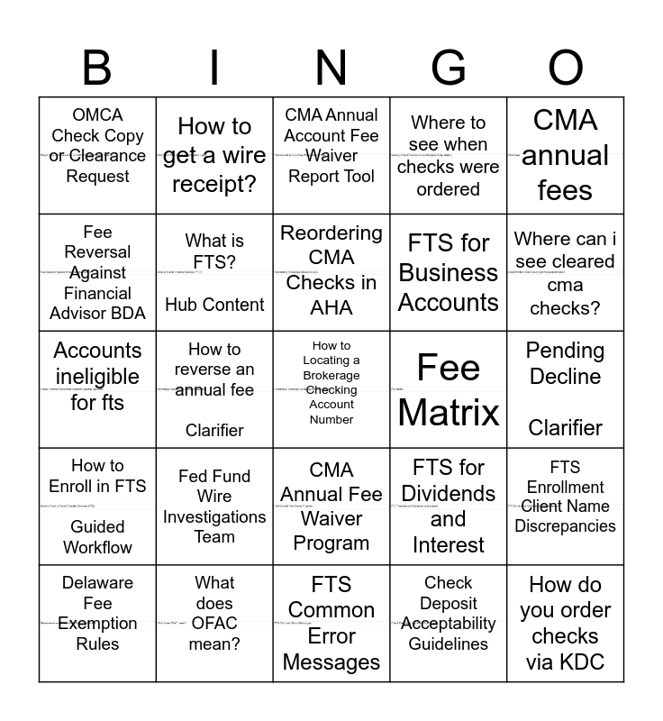 This bingo card has 27 images and 35 words: Merrill Incoming Wire Instructions, FTS Enrollment Form, Merrill Routing Number for ACH Transactions, What is FTS? Hub Content, CMA Annual Fee Waiver Program, Where to see when checks were ordered, Fee Reversal Against Financial Advisor BDA, What is an ACH Transaction? Hub Content, Reordering CMA Checks in AHA, Funds Transfer & Move Money Limits, Accounts ineligible for fts, CMA annual fees, Free!, Wire Fees and Waiver Qualifications, OMCA Check Copy or Clearance Request, Fee Matrix, Check Deposit Acceptability Guidelines, How to reverse an annual fee Clarifier, How to Enroll in FTS Guided Workflow, How to Locating a Brokerage Checking Account Number, FTS for Dividends and Interest, Delaware Fee Exemption Rules, FTS Enrollment Client Name Discrepancies, What does OFAC mean?, CMA Annual Account Fee Waiver Report Tool, Where can i see cleared cma checks?, How do you order checks via KDC, How to enter a stop payment? Clarifier, FTS for Business Accounts, Pending Decline Clarifier, What is CA-VER Clarifier, FTS Common Error Messages, Fed Fund Wire Investigations Team, How to get a wire receipt? and How doImake a fts change.