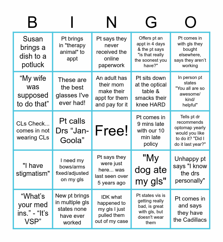 This bingo card has a free space and 24 words: “What’s your med ins.” - “It’s VSP”, I need my bows/arms fixed/adjusted on my gls, An adult has their mom make their appt for them and pay for it, Pt states vis is getting really bad, is great with gls, but doesn't wear them, Pt comes in with gls they bought elsewhere, says they aren’t working, Susan brings a dish to a potluck, Pt brings in "therapy animal" to appt, Pt says they never received the online paperwork, Pt comes in 9 mins late with our 10 min late policy, Tells pt dr recommends optomap yearly would you like to do it? "Did I do it last year?", CLs Check... comes in not wearing CLs, These are the best glasses I've ever had!, "My dog ate my gls", Unhappy pt says "I know the drs personally", “My wife was supposed to do that”, New pt brings in multiple gls states none have ever worked, IDK what happened to my gls I just pulled them out of my case, Offers pt an appt in 4 days & the pt says "is that really the soonest you have?", In person pt states "You all are so awesome/ kind/ helpful", "I have stigmatism", Pt calls Drs “Jan-Goola”, Pt says they were just here... was last seen over 5 years ago, Pt sits down at the optical table & smacks their knee HARD and Pt comes in and says they have the Cadillacs.