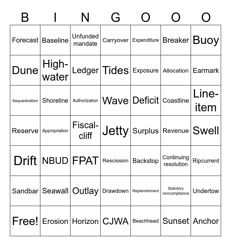 This bingo card has 51 words: Free!, Allocation, Anchor, Appropriation, Authorization, Backstop, Baseline, Beachhead, Breaker, Continuing resolution, Buoy, Carryover, Coastline, Deficit, Drawdown, Drift, Dune, Earmark, Erosion, Expenditure, Exposure, Fiscal-cliff, Forecast, High-water, Horizon, Jetty, Ledger, CJWA, Line-item, Unfunded mandate, Low-tide, NBUD, Outlay, Replenishment, Rescission, Reserve, Revenue, Ripcurrent, Sandbar, Seawall, Sequestration, Shoreline, Statutory noncompliance, Sunset, Surplus, Swell, Tides, FPAT, Undertow, Wave and ADA Violation.