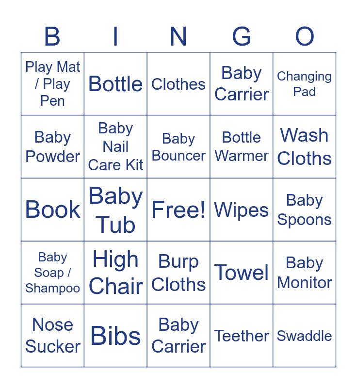 This bingo card has a free space and 24 words: High Chair, Bibs, Baby Bouncer, Nose Sucker, Changing Pad, Play Mat / Play Pen, Baby Powder, Bottle, Wipes, Burp Cloths, Bottle Warmer, Book, Towel, Baby Monitor, Baby Nail Care Kit, Teether, Baby Spoons, Clothes, Wash Cloths, Baby Tub, Swaddle, Baby Soap / Shampoo, Baby Carrier and Baby Carrier.