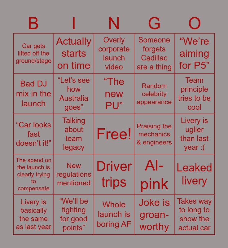 This bingo card has a free space and 24 words: New regulations mentioned, “We’ll be fighting for good points”, “The new PU”, Livery is basically the same as last year, “We’re aiming for P5”, Car gets lifted off the ground/stage, Bad DJ mix in the launch, Actually starts on time, Praising the mechanics & engineers, Driver trips, Random celebrity appearance, “Car looks fast doesn’t it!”, Al-pink, Leaked livery, “Let’s see how Australia goes”, Joke is groan-worthy, Livery is uglier than last year :(, Overly corporate launch video, Team principle tries to be cool, Talking about team legacy, Takes way to long to show the actual car, The spend on the launch is clearly trying to compensate, Someone forgets Cadillac are a thing and Whole launch is boring AF.