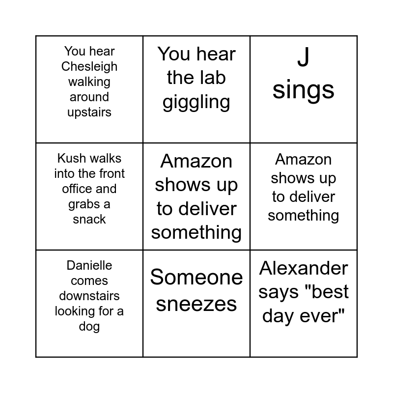 This bingo card has a free space and 10 words: Someone sneezes, J sings, You hear Chesleigh walking around upstairs, Alexander says "best day ever", Kush walks into the front office and grabs a snack, Danielle comes downstairs looking for a dog, You hear the lab giggling, someone says it's cold in here, Amazon shows up to deliver something and When someone says it's cold in here.