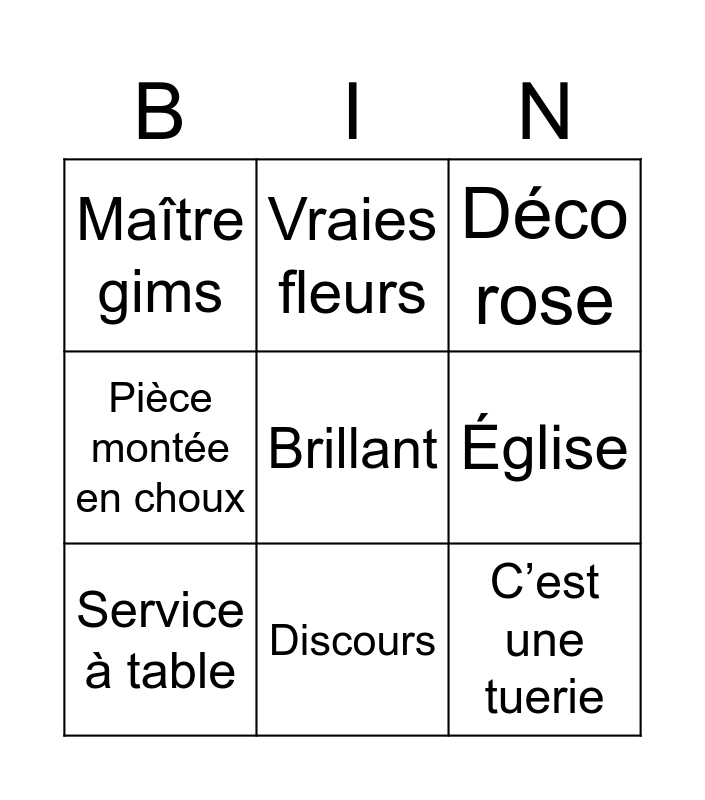 This bingo card has a free space and 8 words: Église, Déco rose, Vraies fleurs, Service à table, Maître gims, C’est une tuerie, Pièce montée en choux and Discours.