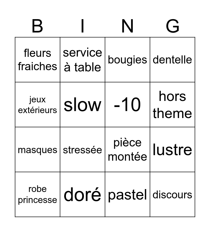 This bingo card has 16 words: doré, lustre, bougies, fleurs fraiches, masques, service à table, pièce montée, pastel, jeux extérieurs, slow, robe princesse, dentelle, stressée, hors theme, -10 and discours.