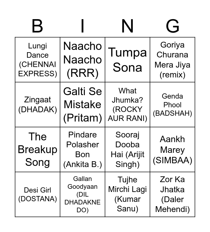 This bingo card has 20 words: Aankh Marey (SIMBAA), Bolo Ta Ra Ra (Daler Mehendi), Tumpa Sona, Jamal Kudu (ANIMAL), Desi Girl (DOSTANA), Zingaat (DHADAK), Gallan Goodyaan (DIL DHADAKNE DO), Lungi Dance (CHENNAI EXPRESS), The Breakup Song, Naacho Naacho (RRR), Pindare Polasher Bon (Ankita B.), Sooraj Dooba Hai (Arijit Singh), Galti Se Mistake (Pritam), Zor Ka Jhatka (Daler Mehendi), What Jhumka? (ROCKY AUR RANI), London Thumakda (QUEEN), Genda Phool (BADSHAH), Goriya Churana Mera Jiya (remix), Tujhe Mirchi Lagi (Kumar Sanu) and Shaky (Sanju Rathod).