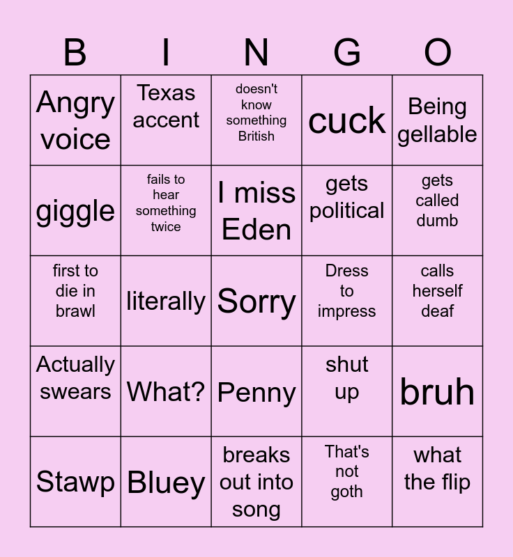 This bingo card has a free space and 24 words: What?, Bluey, I miss Eden, Stawp, Being gellable, Angry voice, giggle, Texas accent, Dress to impress, Penny, gets political, first to die in brawl, shut up, bruh, fails to hear something twice, That's not goth, calls herself deaf, doesn't know something British, gets called dumb, literally, what the flip, Actually swears, cuck and breaks out into song.