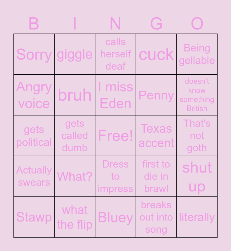 This bingo card has a free space and 25 words: What?, Bluey, I miss Eden, Stawp, Being gellable, Sorry, Angry voice, giggle, Texas accent, Dress to impress, Penny, gets political, first to die in brawl, shut up, bruh, fails to hear something twice, That's not goth, calls herself deaf, doesn't know something British, gets called dumb, literally, what the flip, Actually swears, cuck and breaks out into song.