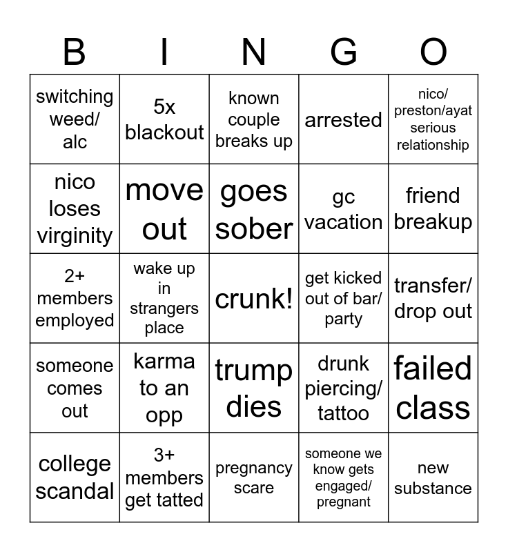 This bingo card has a free space and 24 words: karma to an opp, 3+ members get tatted, goes sober, college scandal, nico/ preston/ayat serious relationship, switching weed/ alc, nico loses virginity, 5x blackout, get kicked out of bar/ party, trump dies, gc vacation, 2+ members employed, drunk piercing/ tattoo, failed class, move out, someone we know gets engaged/ pregnant, transfer/ drop out, known couple breaks up, friend breakup, wake up in strangers place, new substance, someone comes out, arrested and pregnancy scare.