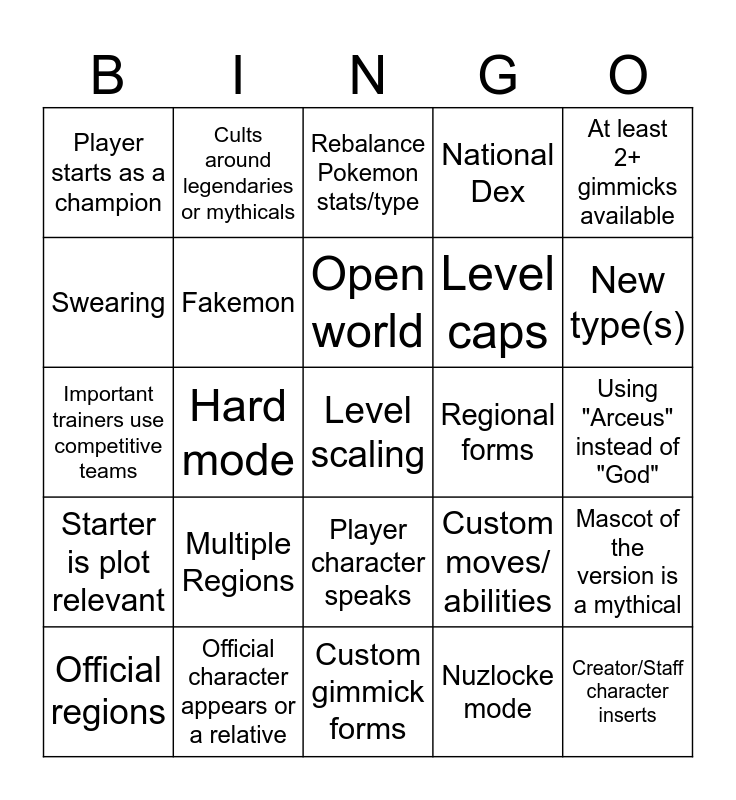 This bingo card has 25 words: Multiple Regions, Custom gimmick forms, Open world, Official regions, At least 2+ gimmicks available, Player starts as a champion, Swearing, Cults around legendaries or mythicals, Regional forms, Player character speaks, Level caps, Important trainers use competitive teams, Custom moves/ abilities, Mascot of the version is a mythical, Fakemon, Creator/Staff character inserts, Using "Arceus" instead of "God", Rebalance Pokemon stats/type, New type(s), Hard mode, Level scaling, Official character appears or a relative, Starter is plot relevant, National Dex and Nuzlocke mode.