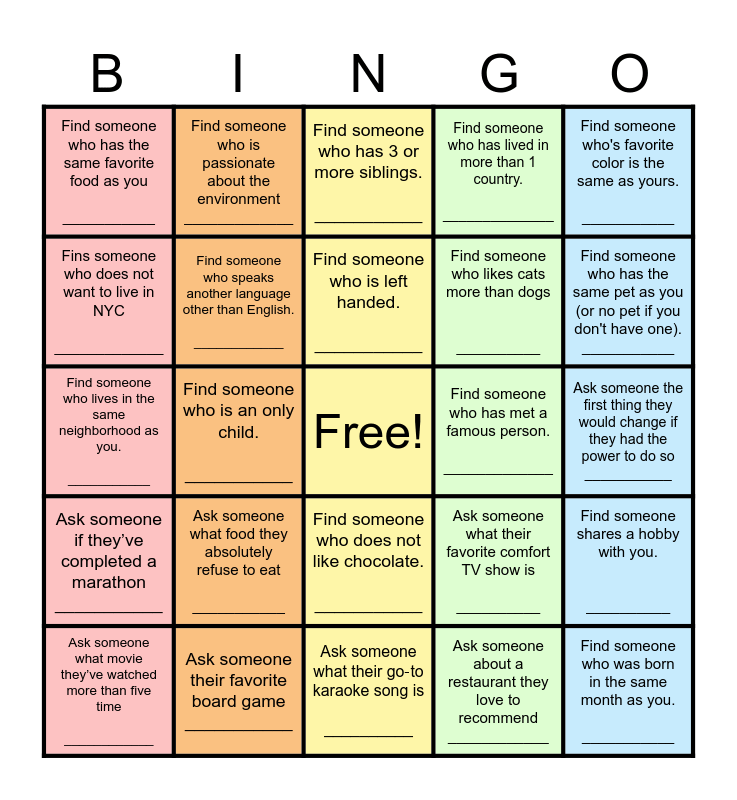 This bingo card has a free space and 25 words: Ask someone what movie they’ve watched more than five time ____________, Ask someone what food they absolutely refuse to eat ___________, Find someone who is left handed. ___________, Ask someone about a restaurant they love to recommend ____________, Find someone who has the same pet as you (or no pet if you don't have one). ___________, Find someone who has the same favorite food as you ___________, Find someone who is passionate about the environment _____________, Find someone who has 3 or more siblings. ___________, Find someone who likes cats more than dogs __________, Find someone shares a hobby with you. __________, Find someone who lives in the same neighborhood as you. ___________, Find someone who speaks another language other than English. ____________, Ask someone what their favorite comfort TV show is __________, Find someone who was born in the same month as you. ___________, Fins someone who does not want to live in NYC _____________, Ask someone their favorite board game ___________, Ask someone what their go‑to karaoke song is __________, Find someone who has lived in more than 1 country. ______________, Ask someone the first thing they would change if they had the power to do so ___________, Ask someone if they’ve completed a marathon ___________, Find someone who is an only child. ___________, Find someone who does not like chocolate. ___________, Find someone who has met a famous person. _____________, Find someone who's favorite color is the same as yours. ___________ and Find someone who is wearing a blue shirt. ____________.