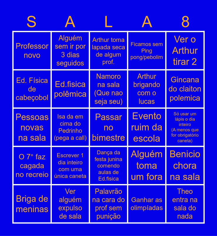 This bingo card has a free space and 24 words: Escrever 1 dia inteiro com uma única caneta, Ver alguém expulso de sala, Namoro na sala (Que nao seja seu), Briga de meninas, Ver o Arthur tirar 2, Professor novo, Ed. Física de cabeçobol, Alguém sem ir por 3 dias seguidos, Evento ruim da escola, Dança da festa junina comendo aulas de Ed.fisica, Arthur brigando com o lucas, Pessoas novas na sala, Alguém toma um fora, Benicio chora na sala, Ed.fisica polêmica, Ganhar as olimpíadas, Só usar um lápis o dia inteiro (A menos que for obrigatório caneta), Arthur toma lapada seca de algum prof., Gincana do claiton polemica, Isa da em cima do Pedrinho (pega a call), Theo entra na sala do nada, O 7° faz cagada no recreio, Ficamos sem Ping pong/pebolim and Palavrão na cara do prof sem punição.