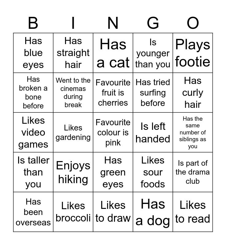 This bingo card has a free space and 44 words: Likes to play chess, Likes to read, Plays an instrument, Has been overseas, Has been to at least 3 other Australian states, Has a dog, Has a cat, Plays netball, Plays footie, Likes broccoli, Is younger than you, Is left handed, Has green eyes, Enjoys hiking, Is older than you, Likes to draw, Has been to the snow, Likes video games, Likes spicy food, Has curly hair, Has straight hair, Is wearing a watch, Has brown eyes, Has blue eyes, Likes to cook or bake, Has the same number of siblings as you, Lives in the same suburb as you (e.g. K-Flat), Favourite colour is blue, Likes sour foods, Is taller than you, Is shorter than you, Is part of the drama club, Wears glasses, Favourite colour is yellow, Likes gardening, Knows how to knit/crochet, Favourite fruit is watermelon, Favourite fruit is orange, Favourite fruit is cherries, Has broken a bone before, Has tried surfing before, Has done an escape room before, Went to the cinemas during break and Can speak more than one language.