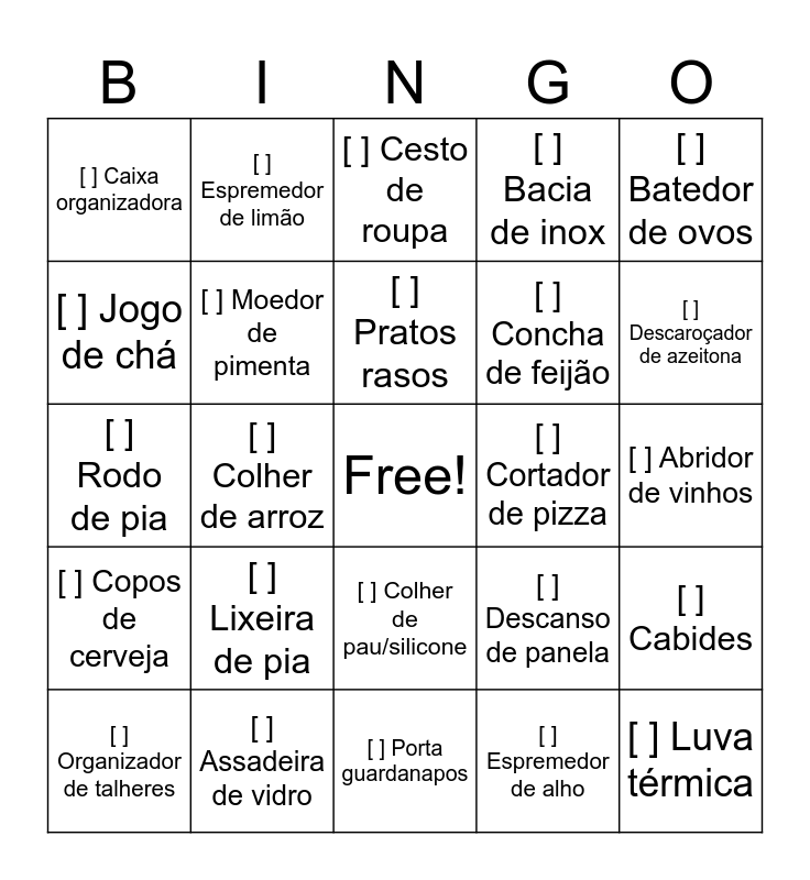 This bingo card has a free space and 70 words: [ ] Abridor de latas, [ ] Abridor de vinhos, [ ] Açucareiro, [ ] Afiador de facas, [ ] Assadeira de vidro, [ ] Assadeira de pizza, [ ] Bacia de inox, [ ] Balde de gelo, [ ] Batedor de ovos, [ ] Bule de café, [ ] Cabides, [ ] Cafeteira, [ ] Caixa organizadora, [ ] Cesto de roupa, [ ] Chaleira, [ ] Colher de arroz, [ ] Colher de pau/silicone, [ ] Concha de feijão, [ ] Copos de água, [ ] Copos de cerveja, [ ] Cortador de pizza, [ ] Descanso de panela, [ ] Descaroçador de azeitona, [ ] Desentupidor de pia, [ ] Escorredor de macarrão, [ ] Escorredor de pratos, [ ] Escumadeira, [ ] Espátula de bolo, [ ] Espremedor de alho, [ ] Espremedor de batata, [ ] Espremedor de limão, [ ] Faca de pão, [ ] Faca de carne, [ ] Forma de gelo, [ ] Forma de pudim, [ ] Fruteira, [ ] Garrafa térmica, [ ] Jarra de suco, [ ] Tupperware, [ ] Jogo de chá, [ ] Jogo de sobremesa, [ ] Lixeira de pia, [ ] Luva térmica, [ ] Manteigueira, [ ] Martelo de carne, [ ] Moedor de pimenta, [ ] Organizador de talheres, [ ] Pá de lixo, [ ] Pano de prato, [ ] Pegador de massa, [ ] Pegador de salada, [ ] Petisqueira, [ ] Peneira, [ ] Porta condimentos, [ ] Porta guardanapos, [ ] Porta sabonete líquido, [ ] Pratos rasos, [ ] Pratos fundos, [ ] Prendedor de embalagem, [ ] Ralador, [ ] Rodo de pia, [ ] Saladeira, [ ] Saleiro, [ ] Tábua de corte, [ ] Taças de vinho, [ ] Tesoura de cozinha, [ ] Tigela, [ ] Torradeira, [ ] Vaporizador de roupas and [ ] Vassoura.