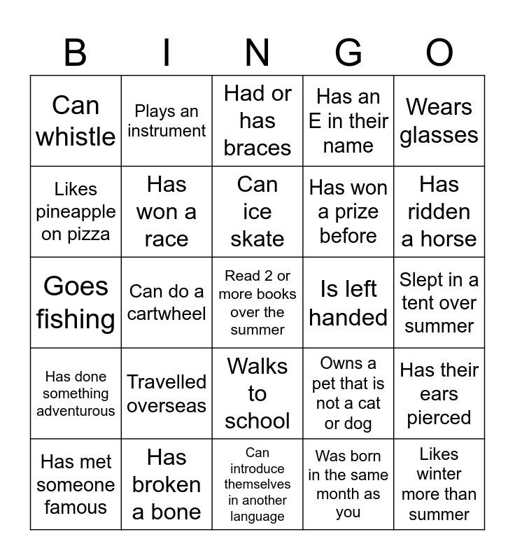 This bingo card has a free space and 24 words: Has met someone famous, Travelled overseas, Can ice skate, Was born in the same month as you, Wears glasses, Can whistle, Plays an instrument, Had or has braces, Is left handed, Slept in a tent over summer, Goes fishing, Has won a race, Owns a pet that is not a cat or dog, Has their ears pierced, Likes pineapple on pizza, Has broken a bone, Can introduce themselves in another language, Has an E in their name, Has ridden a horse, Has done something adventurous, Can do a cartwheel, Walks to school, Has won a prize before and Likes winter more than summer.