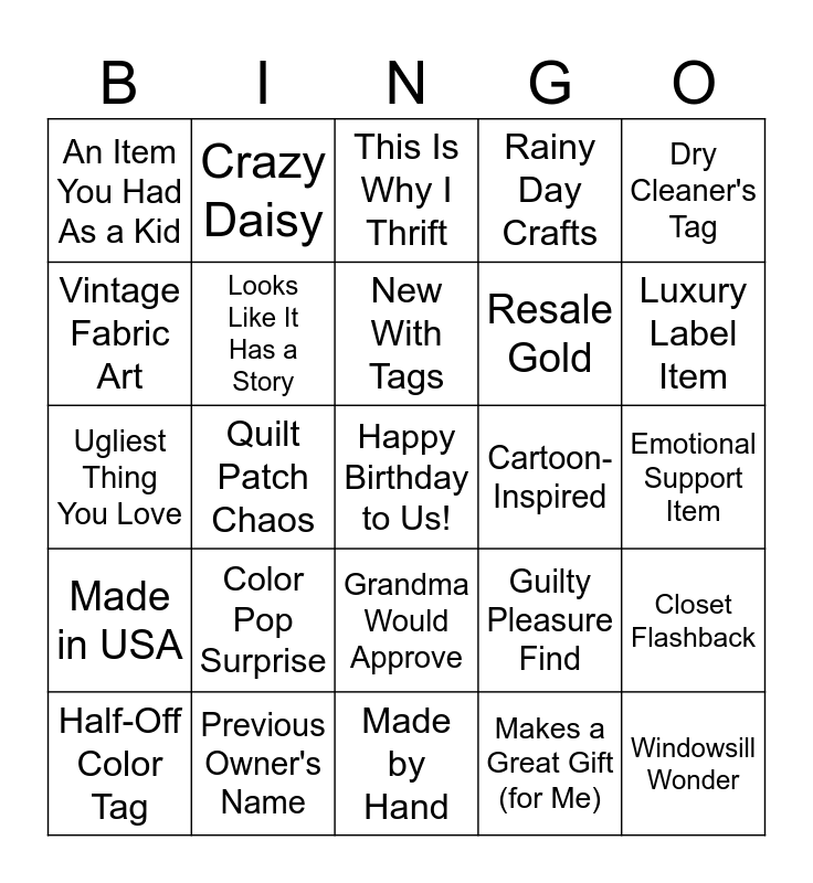 This bingo card has a free space and 24 words: Color Pop Surprise, Previous Owner's Name, New With Tags, Half-Off Color Tag, Dry Cleaner's Tag, An Item You Had As a Kid, Vintage Fabric Art, Crazy Daisy, Cartoon-Inspired, Grandma Would Approve, Resale Gold, Ugliest Thing You Love, Guilty Pleasure Find, Closet Flashback, Looks Like It Has a Story, Makes a Great Gift (for Me), Emotional Support Item, This Is Why I Thrift, Luxury Label Item, Quilt Patch Chaos, Windowsill Wonder, Made in USA, Rainy Day Crafts and Made by Hand.