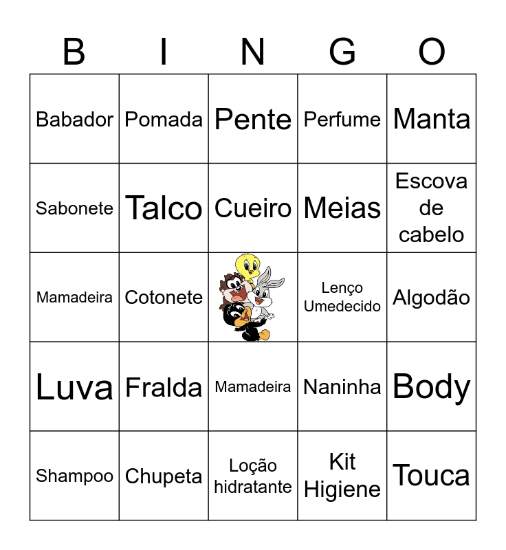 This bingo card has a free space and 24 words: Fralda, Chupeta, Cueiro, Shampoo, Manta, Babador, Sabonete, Pomada, Lenço Umedecido, Mamadeira, Meias, Mamadeira, Naninha, Body, Talco, Kit Higiene, Algodão, Pente, Escova de cabelo, Cotonete, Touca, Luva, Perfume and Loção hidratante.