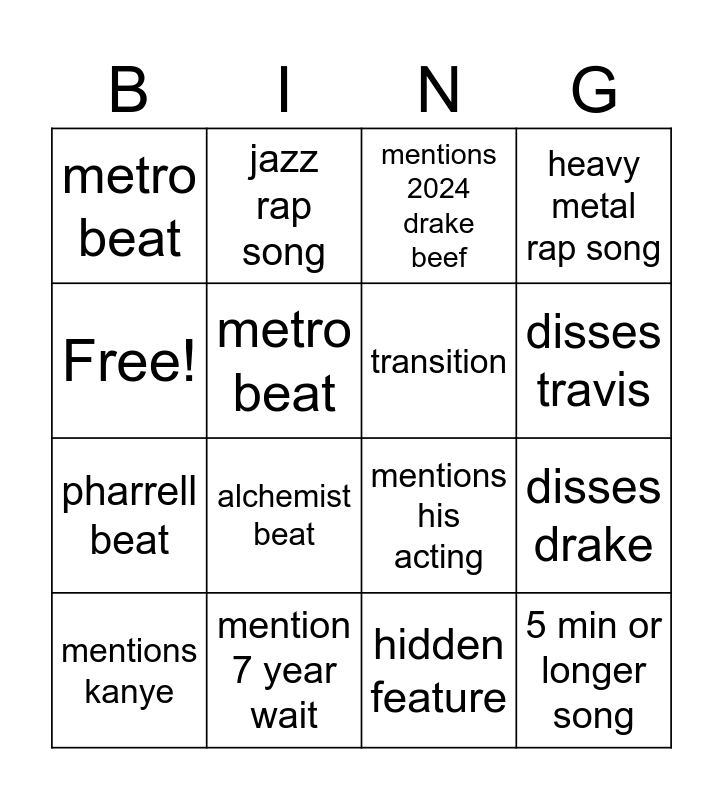 This bingo card has 16 words: mention 7 year wait, disses drake, mentions 2024 drake beef, metro beat, pharrell beat, jazz rap song, mentions his acting, hidden feature, Free!, metro beat, mentions kanye, heavy metal rap song, alchemist beat, disses travis, transition and 5 min or longer song.