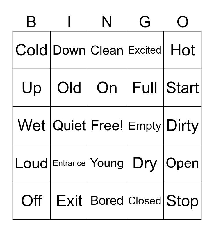 This bingo card has a free space and 24 words: Entrance, Exit, On, Off, Hot, Cold, Up, Down, Empty, Young, Full, Wet, Dry, Open, Old, Closed, Dirty, Clean, Start, Quiet, Stop, Loud, Excited and Bored.