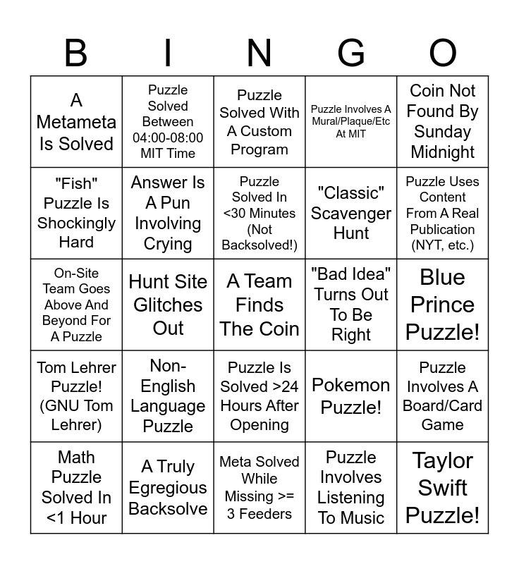 This bingo card has a free space and 30 words: A Truly Egregious Backsolve, Knitting Puzzle!, Hunt Site Glitches Out, Party Size Goes Negative, A Metameta Is Solved, Puzzle Solved With A Custom Program, Answer Is A Pun Involving Crying, Puzzle Is Solved >24 Hours After Opening, "Bad Idea" Turns Out To Be Right, Meta Solved While Missing >= 3 Feeders, Blue Prince Puzzle!, Taylor Swift Puzzle!, Puzzle Involves Listening To Music, Puzzle Includes A Smoot Reference, Puzzle Uses Content From A Real Publication (NYT, etc.), Puzzle Uses Out-Of-Date Data, Pokemon Puzzle!, Tom Lehrer Puzzle! (GNU Tom Lehrer), Non-English Language Puzzle, Coin Not Found By Sunday Midnight, On-Site Team Goes Above And Beyond For A Puzzle, XKCD Puzzle!, Puzzle Solved Between 04:00-08:00 MIT Time, "Classic" Scavenger Hunt, "Fish" Puzzle Is Shockingly Hard, Puzzle Involves A Mural/Plaque/Etc At MIT, Puzzle Involves A Board/Card Game, Math Puzzle Solved In <1 Hour, Puzzle Solved In <30 Minutes (Not Backsolved!) and Meta Solved In <2 Hours.