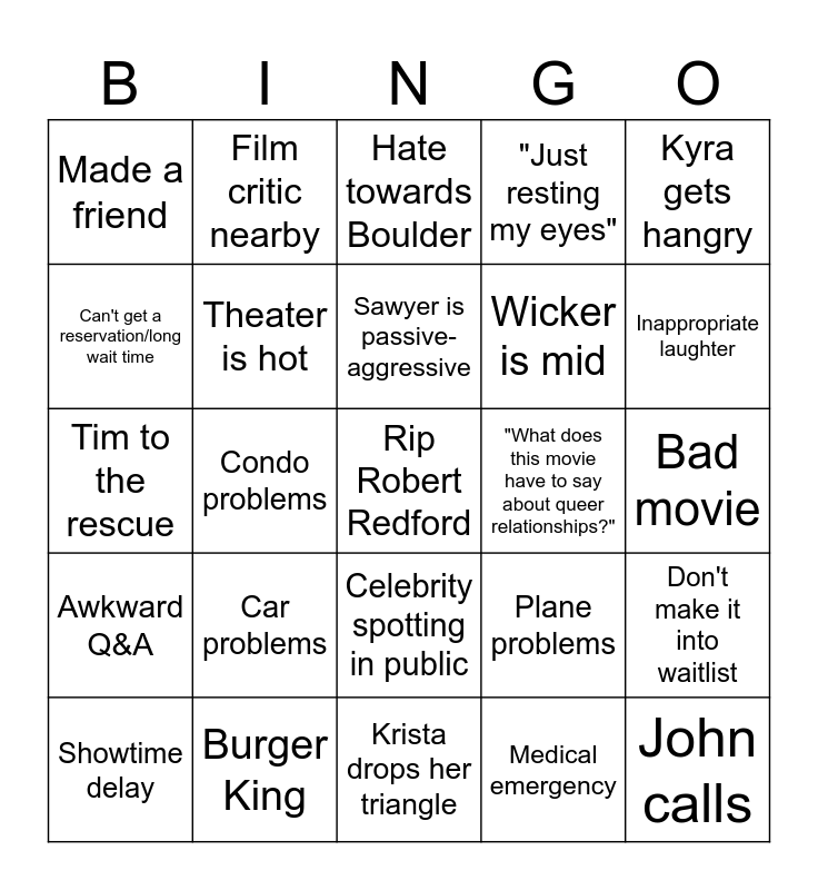 This bingo card has a free space and 24 words: Car problems, Burger King, Sawyer is passive-aggressive, Showtime delay, Kyra gets hangry, Made a friend, Can't get a reservation/long wait time, Film critic nearby, "What does this movie have to say about queer relationships?", Celebrity spotting in public, Wicker is mid, Tim to the rescue, Plane problems, Don't make it into waitlist, Theater is hot, Medical emergency, Bad movie, Hate towards Boulder, Inappropriate laughter, Condo problems, John calls, Awkward Q&A, "Just resting my eyes" and Krista drops her triangle.