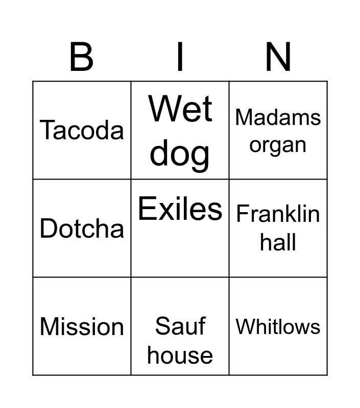 This bingo card has 9 words: Mission, Madams organ, Wet dog, Dotcha, Tacoda, Franklin hall, Exiles, Whitlows and Sauf house.