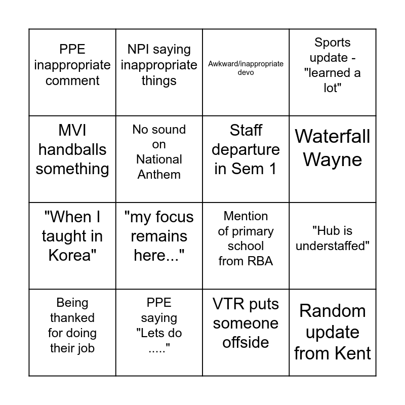 This bingo card has 16 words: PPE saying "Lets do .....", "Hub is understaffed", Awkward/inappropriate devo, PPE inappropriate comment, "When I taught in Korea", NPI saying inappropriate things, Mention of primary school from RBA, VTR puts someone offside, MVI handballs something, No sound on National Anthem, Being thanked for doing their job, Sports update - "learned a lot", "my focus remains here...", Waterfall Wayne, Staff departure in Sem 1 and Random update from Kent.