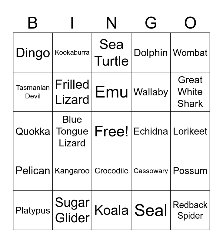 This bingo card has a free space and 25 words: Kangaroo, Koala, Emu, Platypus, Wombat, Dingo, Tasmanian Devil, Kookaburra, Echidna, Crocodile, Wallaby, Quokka, Cassowary, Possum, Frilled Lizard, Cockatoo, Lorikeet, Sea Turtle, Great White Shark, Blue Tongue Lizard, Redback Spider, Sugar Glider, Pelican, Dolphin and Seal.